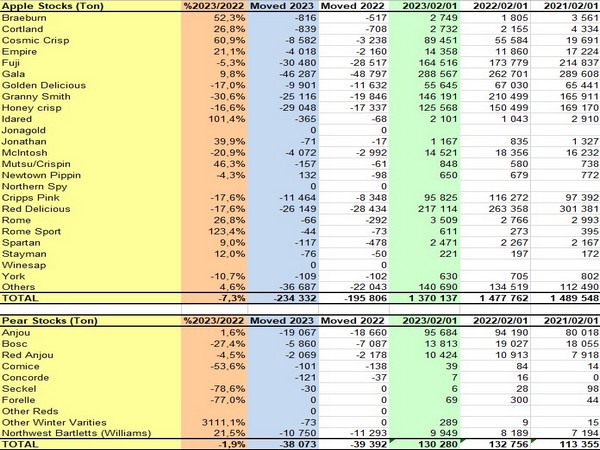 In the USA, apple stocks as of 1 February 2023 stood at 1 370 137 T (-7.3% compared to 2022), while pear stocks declined to 130 280 T (-1.9% less than 2022). The apples stocks of Fuji was down with -5.3%, Granny Smith -30.6%, Honeycrisp -16.6%, Red Delicious -17.6% and Golden Delicious also lower by -17%. Gala increased by 9.8%, Cosmic Crisp is up by 60.9% and Empire is 21.1% higher.