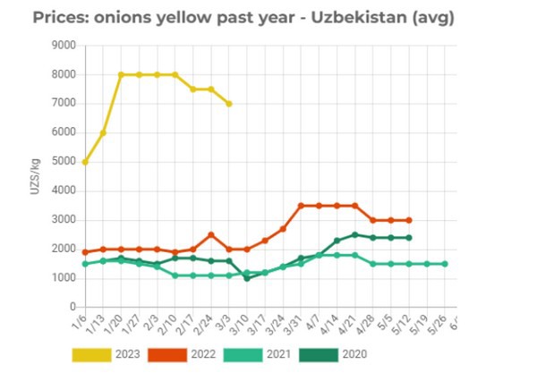 According to EastFruit price monitoring, the average wholesale price for onions in Uzbekistan decreased from 8 000 to 7 000 UZS/kg ($0.70 to $0.62) from February 10 to March 3, 2023, i.e. in three weeks by 12.5%.