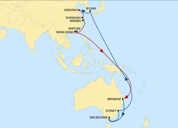The full rotation will be as follows: Busan – Qingdao – Shanghai – Ningbo – Hong Kong – Yantian – Brisbane – Melbourne – Sydney – Busan.