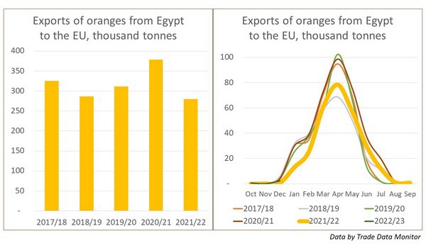 The EU, along with Russia and the Middle East, is one of the three key markets for Egyptian oranges, and the drop in exports there has been a rather heavy blow to the local industry. In total, the EU countries and the UK imported only 280 000 tonnes of oranges from Egypt in the 2021/22 season, which is 14% less than the average for the previous four seasons.