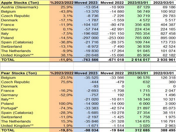 WAPA, the World Apple and Pear Association, released the apple and pear stock figures for 1 March 2023. The figures show that in Europe apple stocks decreased by 11% compared to 2022 to reach 2 614 017 T, while pear stocks decreased by 19.5% to reach 312 685 T. In the USA, apple stocks as of 1 March 2023 stood at 1 181 363 T (-7.3% compared to 2022), while pear stocks  is up to 97 266 T (1.6% more than 2022).