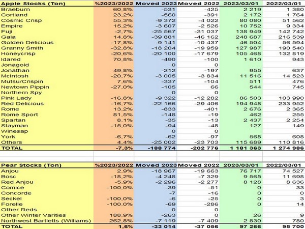 WAPA, the World Apple and Pear Association, collects the monthly stock figures for apples and pears from Europe and the United States. WAPA can reveal that European apple stocks stood at 2 614 017 T as of 1 March 2023, which decreased by 11% compared to 2022. The decrease was mainly due to a reduction in the following varieties: a -23.3% drop in Golden Delicious, Idared -19.5%, Jonagold -31.8%, Gala -30% and Fuji -21.7%. Cripps Pink increased by 35.1%, Granny Smith is up by 11.4% and Red Jonaprince is 13.4% higher.