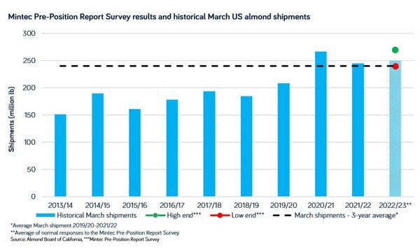 Market participants surveyed by Mintec in the first week of April were expecting strong shipments ahead of the March position report, which is due for release on 11th April. Estimates for February almond shipments were reported in the range of 240-270 million pounds, with most market participants returning figures of 245-255 million pounds.