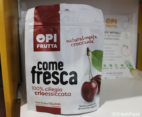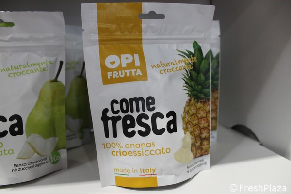 "We patented a freeze-drying technology: we practically cut the fruit and freeze it rapidly at -20/-30 °C, so that water can separate and solidify in small ice crystals. The fruit is then vacuum-sealed to make the small ice crystal sublimate and maintain it dry and crunchy. At this point, the dried pieces are bagged in a controlled atmosphere to avoid contact with air humidity and preserve their freshness. The result is a crunchy piece of fruit that immediately melts in the mouth and rehydrates with the saliva, releasing its authentic flavor and organoleptic qualities of the fresh fruit."