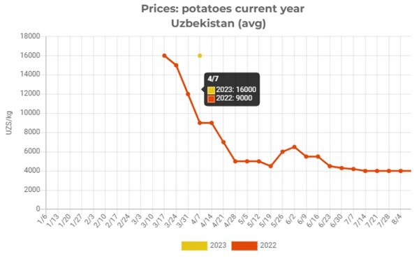 At the same time, current wholesale prices for last year’s potatoes (of the 2022 harvest) in Uzbekistan are close to last year’s levels. As of April 7, 2023, the average wholesale price was 4 000 UZS/kg ($0.35) – 4 times cheaper than early potatoes. However, both early and last year’s potatoes are in demand.