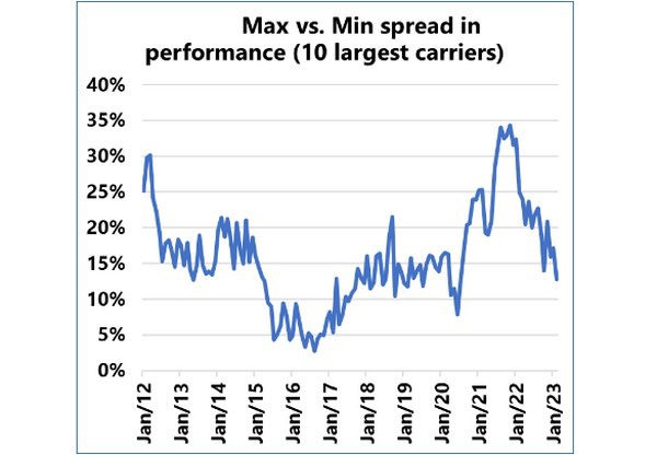 An interesting aspect however, was that while there was a lot of differentiation in the early part of the last decade (between 2012-2015), but when the industry became severely loss-making (most notably the price war culminating in 2016), this led to a temporary elimination of this differentiation. In the last few years, ever since freight rates started going through the roof, we saw the difference between the most and least reliable of the 10 largest shipping lines start to increase again. This is shown in the figure below.