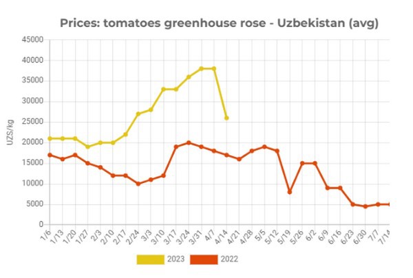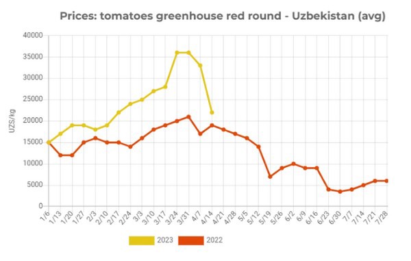 According to EastFruit price monitoring, from April 7 to April 14, 2023, the average wholesale price for round red tomatoes decreased from 33 000 to 22 000 UZS/kg (from $2.90 to $1.93). Considering that the prices have been falling for the second week in a row, from March 31 to April 14, 2023, the average wholesale price for round red tomatoes decreased from 36 000 to 22 000 UZS/kg (from $3.15 to $1.93), i.e., by 39% in the last two weeks. At the same time, current wholesale prices approached last year’s levels. The average wholesale price on April 14, 2023, was only 16% higher than on the same date last year.