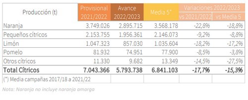 The adverse and extreme weather conditions recorded in the Spanish production areas since the flowering and fruit setting due to excessive rainfall, as well as the very high temperatures reached during the fruit's growth (with no rainfall and limitations in access to irrigation), as well as the delay in the previous harvest, have led to the expected production being estimated at 5,794 million tons, the lowest since the 2012/13 season.