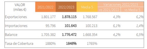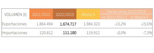 In terms of volume, imports amounted to 111,180 tons, which is 8% less than in the 2021/22 season and -7.3% below average. In terms of value, they amounted to 101.6 million Euro; 6.3% more than in the previous season and +2.3% higher than average. The trade balance is highly positive, with a coverage rate of 1,850%.