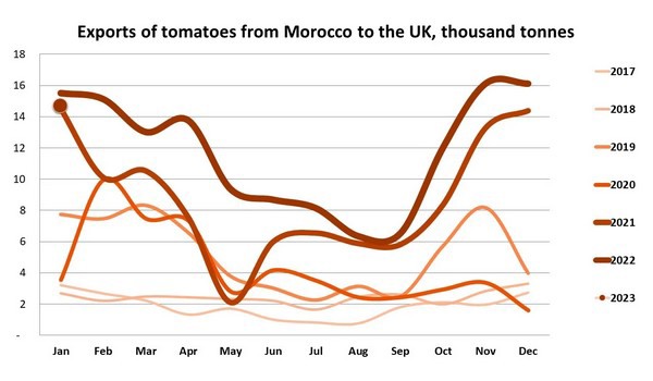 Supplies from Morocco to the UK peak during the winter months. In the spring of 2021, there was a decrease in exports. However, in 2022, Moroccan tomato exporters managed to expand the vegetable sales season, which was reflected in the overall annual increase in supplies.
