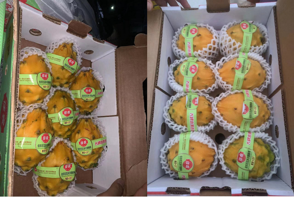 The newly-launched Ecuadorian yellow pitaya is sold in different sizes of 2.5kg/box, 6-7-8 pieces/box and the current wholesale price is about 300 RMB per box.