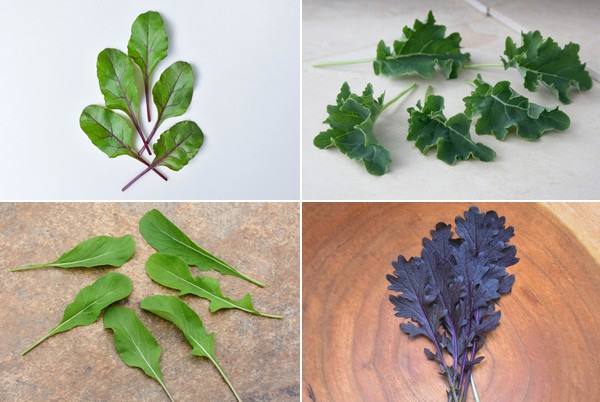 Clockwise from top left: beet, kale, mustard, and arugula.