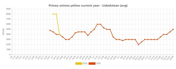 Over the past week, wholesale prices for last year’s onion have also decreased, which is explained by the fact that a sharp increase in the supply of new crop onions in the domestic market of Uzbekistan is putting pressure on last year’s onion prices. From April 14 to April 21, 2023, the average wholesale price for last year’s onions decreased from 6 000 to 5 000 UZS/kg (from $0.70 to $0.35). At the same time, as of April 21, 2023, the average wholesale price for last year’s onions is almost 1.5 times higher than on the same date last year.