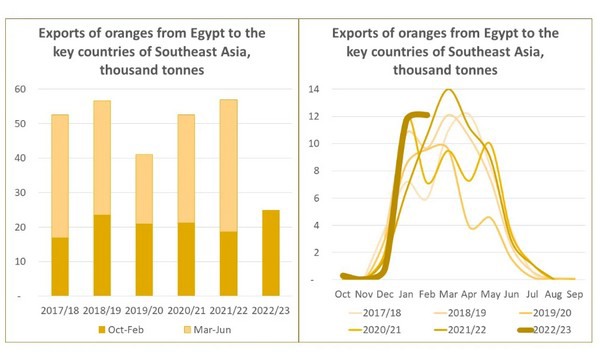 In the first five months of the current season (October 2022 – February 2023), Egypt exported almost 25 000 tonnes of oranges to the main countries of Southeast Asia (Malaysia, Indonesia, Singapore, Thailand, and Cambodia), which became the largest export volume in this period for at least the last five years.