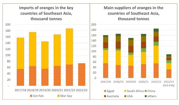 In total, these countries of Southeast Asia import from 150 000 to 180 000 tonnes of oranges during the season, and the market in this region remains extremely concentrated. The two leading countries (South Africa and Egypt) provide almost two-thirds of all orange supplies there, and the total share of the Top-5 suppliers (South Africa, Egypt, China, Australia, and the USA), depending on the season, can reach 96%.