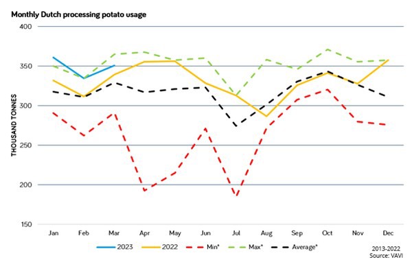 Dutch potato processors union Vavi recently released the latest Dutch processing figures which showed strong demand for raw material in March 2023. The figures indicate that the processing potato usage for the month stands at 350.7 thousand metric tonnes, up by 11.3 thousand metric tonnes, an increase of 3.3% compared to the same period last year.