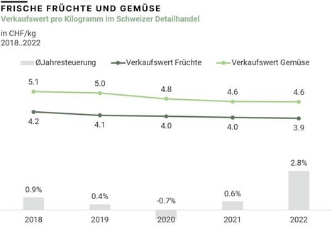 In 2022, 425 million kg of fresh fruits and 439 million kg of fresh vegetables were sold in the Swiss retail sector. Thus, retail sales fell for a second year in a row, but were still above those of 2018 and 2019. The value per kilogram of fruit and vegetables sold again fell slightly in 2022. In the fresh vegetable segment, potatoes and tomatoes were the top sellers, while bananas and apples were by far the most popular table fruits.