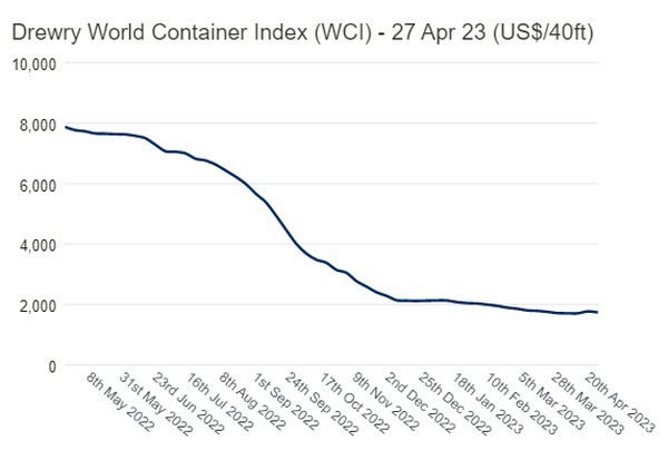 Drewry’s detailed assessment for Thursday, 27 April 2023 shows that the composite index has decreased by 2% this week, dropping by 78% when compared with the same week last year.