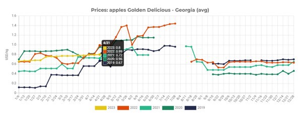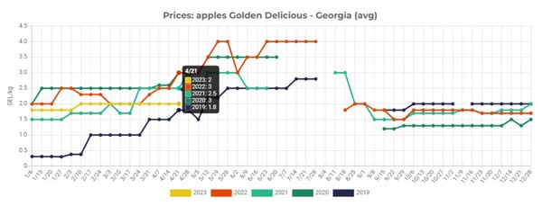 If you look at the prices for apples of popular international varieties such as Golden Delicious in local currency, Georgian lari (GEL), they seem incredibly low – almost as in 2019 when apple prices reached record lows in all European countries. By the way, it is the “Golden” that accounts for the bulk of apple consumption in Georgia.