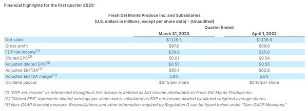 Fresh Del Monte Produce Inc. today reported financial results for the first quarter ended March 31, 2023.