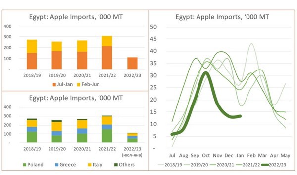 In the first seven months of the current MY 2022/23 (July-January), Egypt imported just 110,000 tonnes of apples, almost half of the import volumes in the same period of the previous season. Just to remind, apple imports have reached record high 300,000 tonnes in the previous MY 2021/22, with the main part of trading volumes registered in July-January. Thus, Egypt will most likely import record low volumes of apples over the whole current MY, as imports in February-June will unlikely compensate a downturn.