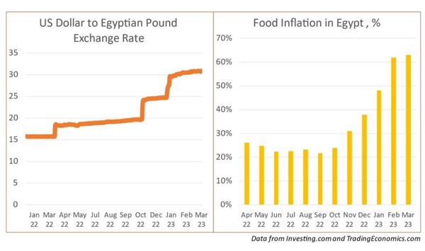 The last hit was the Russian war against Ukraine, followed by rapidly rising food prices and rapid devaluation of the national currency in Egypt. As a result, the food inflation has exceeded 60% in Egypt by February 2023, while the USD to EGP exchange rate has doubled!