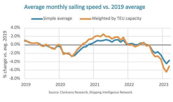 During the COVID-19 pandemic, liner operators increased the average sailing speed by up to 4% due to strong demand and widespread port congestion. Today, the situation is very different and in the first quarter of 2023 the average sailing speed has slowed to 13.8 knots, down 4% y/y, and could drop by 10% before 2025.