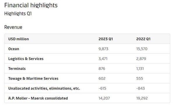 Ocean revenue decreased by USD 5.7bn to USD 9.9bn. Profitability for the quarter was significantly lower compared to Q1 2022, primarily due to lower freight rates and volumes, as demand softened. However, proactive cost containment measures have been successful, and the Ocean contract negotiation season is proceeding in line with expectations.