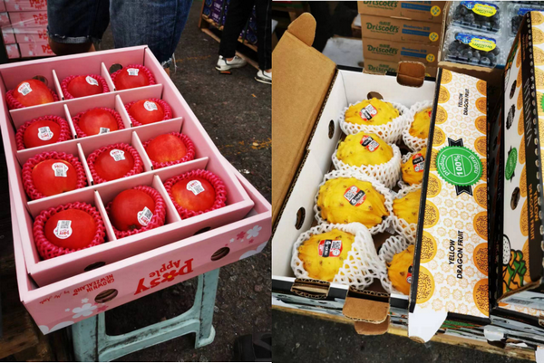Left: Posy apple gift box; Right: Yellow dragon fruit from Ecuador