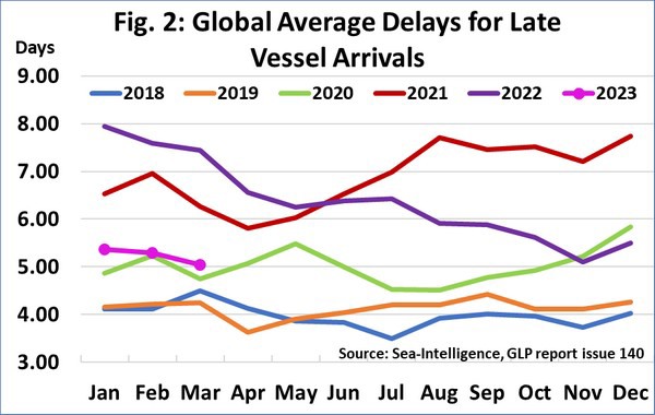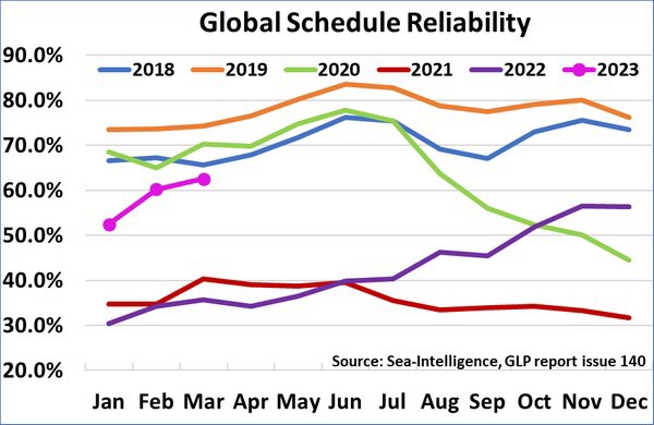 Sea-Intelligence has published issue 140 of the Global Liner Performance (GLP) report, with schedule reliability figures up to and including March 2023. As the report itself is quite comprehensive and covers schedule reliability across 34 different trade lanes and 60+ carriers, this press release will only cover the global highlights from the full report.