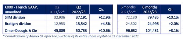 Omer-Decugis & Cie posted a 10.6% increase in its second-quarter revenue compared to Q2 2021/22, mainly driven by the SIIM division, up 12.9% over the quarter, while the Bratigny wholesale division saw a 4.5% increase in revenue. This strong second quarter was achieved in a market environment characterised by enduring inflation and a slowdown in household consumption, particularly at national level.