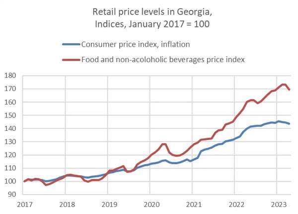 The strengthening of Georgia’s currency is also important. Holding all else equal, when local currency gains value, it can afford more imported products with the same amount – imports become cheaper. The value of the US Dollar against the Georgian Lari reduced by 3% in April 2023 compared to March 2023.