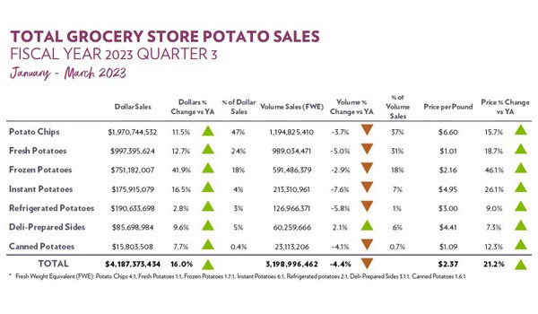 Potato retail sales increased 16.0% in sales, but decreased in volume by -4.4% from January – March 2023 compared to the same timeframe a year ago. Despite a decrease, volume sales remain above pre-pandemic levels.