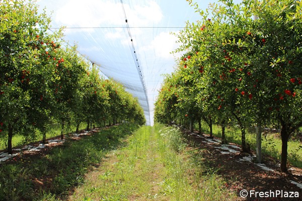 "All the orchards are located in Castellaneta, in the province of Taranto. The first planting dates back to 2014. The plants are tied up into an umbrella shape, with 'Y' poles and steel wires along which the branches are directed. The planting distance is 5.70x2/3 m and is done on a raised ridge for two reasons: to save water and to avoid water stagnation during excessive rainfall. A film with a light-reflecting function is then laid on that ridge, which ensures homogeneous ripening and intense fruit color."