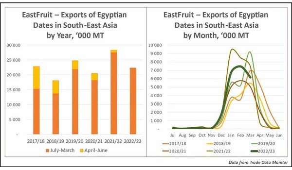 In the MY 2021/22, South-East Asia imported record high 28,400 tonnes of dates from Egypt. Meanwhile, in the first nine months of the current MY 2022/23 (July-March), Egyptian exporters shipped just 22,400 tonnes of dates to the region. Such volumes are lower than a year before, but still are on one of the highest levels over the past years.
