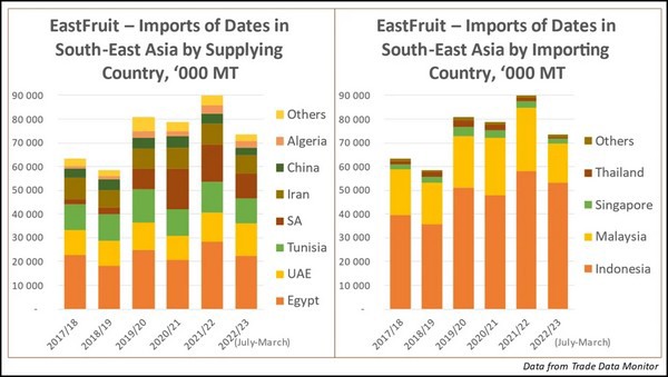 In addition, despite a drop in exports, Egypt will still be the leading exporter of dates to South-East Asia. The UAE, Egypt’s nearest competitor, shipped just 13,700 tonnes of dates to South-East Asia in July 2022 – March 2023. Imports from other countries will even less significant: 10,500 tonnes from Tunisia, 10,400 tonnes from Saudi Arabia and 7,700 tonnes from Iran.