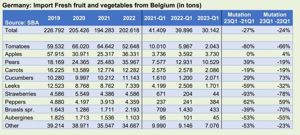 According to the SBA, German imports of Belgian tomatoes were virtually zero in 2023's Q1. It barely topped 2,000 tons, while in the same period of 2022, it was 6,000 tons. Belgian pears did less well in Q1 after a good Q1 in 2022. In the first quarter of this year, overall German imports of Belgian produce were a quarter smaller than in the same period of the previous two years.