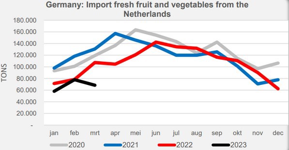 In Germany, Dutch fruit and vegetable imports declined sharply again in 2023's first quarter. It was down 20% compared to last year's first quarter and as much as a third less than Q1 of 2021. In absolute quantities, that amounts to over 50,000 tons less than in last year's first quarter and a minus of 100,000+ tons compared to the same time in 2021.