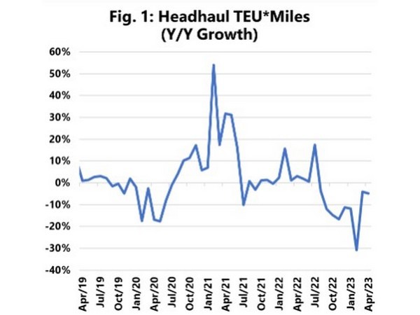 When we look at TEU*Miles (which also accounts for the distance a container has to travel), there was a sharp 6-month growth decline that reverted to a “only” a minor level of growth decline in March 2023. This new trend continued in April as well, albeit somewhat less strong.