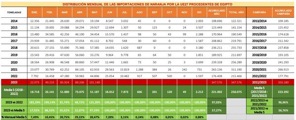 The increase in imports from Egypt was outstanding. The country recovered its production volume, with a 97% increase compared to the same period in 2022 (+171,200 t) and a 57.3% (+126,600 t) increase over the average, which allowed it to supply 94.9% (347,576 tons) of all EU oranges imported from third countries in this period.