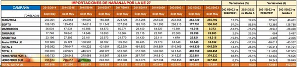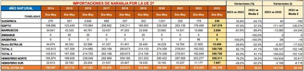 The EU imported 723,984 tons of oranges from third countries between September 2022 and May 2023, i.e. 31.6% or 173,700 tons more than in the same period of the 2021/22 campaign and 16.5% (102,400 tons) more than the average, according to the data from the latest Enhanced Monitoring on EU Citrus Imports report published by the Ministry of Agriculture, Fisheries, and Food.