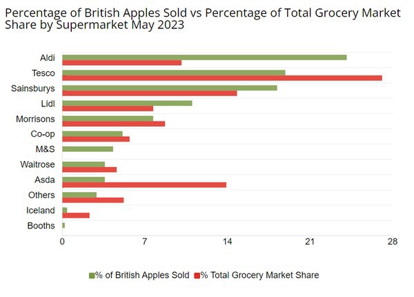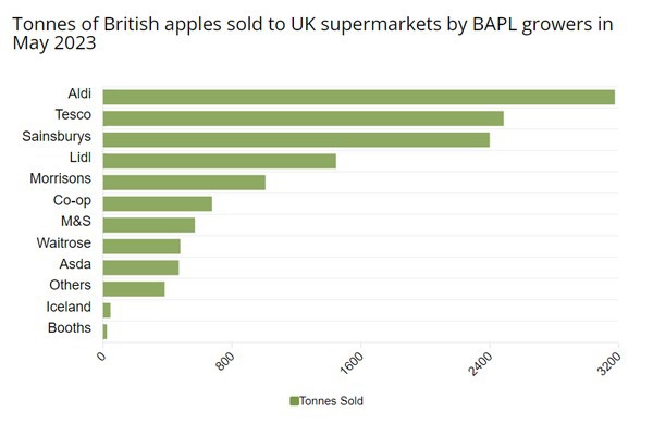 At almost 3,200 tons, Aldi is still the largest customer of BAPL apples in the UK, followed by Tesco and Sainsburys.