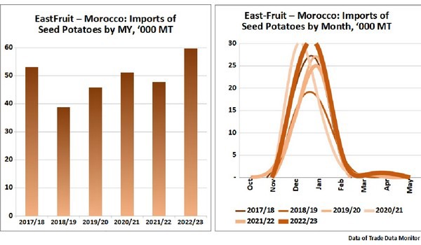 Considering rather large volumes of local production of ware potatoes (it reached record high of 1,64 mln tonnes in 2021), it is not surprising that the demand for high-quality seed potatoes in rather high in Morocco. Thus, Moroccan importers continue to increase imports of seed potatoes, with the season lasting from October to May and peaking in winter.