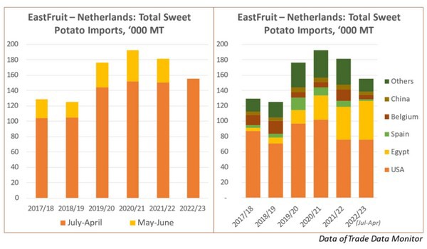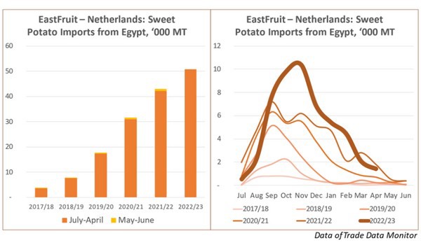 In the previous MY 2021/22 Egypt exported 42,000 tonnes of sweet potatoes to the Netherlands, while exports in the first nine months of the current MY reached 51,000 tonnes. Considering that exports in May-June are usually rather low, the final result will not change cardinally over two remaining months.