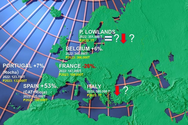 France: variations between the various French basins are expected. Production potential has been significantly reduced, with a gradient from south-east to north: rather poorer in the south and improving upwards, and therefore a gradient from summer varieties (Guyot) to autumn varieties.