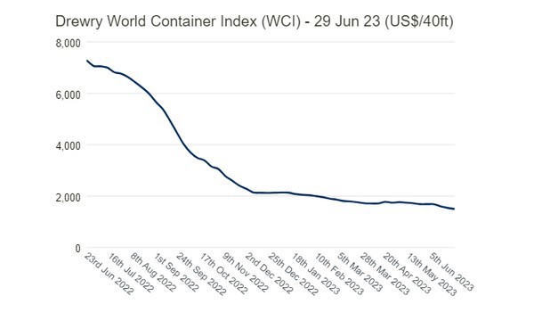 The latest Drewry WCI composite index of $1,494.46 per 40-foot container is now 86% below the peak of $10,377 reached in September 2021. It is 44% lower than the 10-year average of $2,688, indicating a return to more normal prices, but remains 5% higher than average 2019 (pre-pandemic) rates of $1,420.