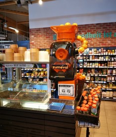 In addition to juice presses for food retailers, the Zumoval marketing partner also offers a smaller machine for restaurants and hotels. "In this area, there is usually very little space available, which is then also mainly needed for the breakfast buffet. However, we have been using this machine for three years now in a REWE store in Oberwesel (on the right in the picture). In view of the small sales area, we had to place the machine on the salad bar, but so far the arrangement has worked perfectly," Weber concludes.