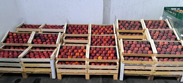French stone fruits in the goods receiving area of the Cologne-based company: yellow nectarines (left) of the Nectaronda variety and white peaches of the Monange variety.