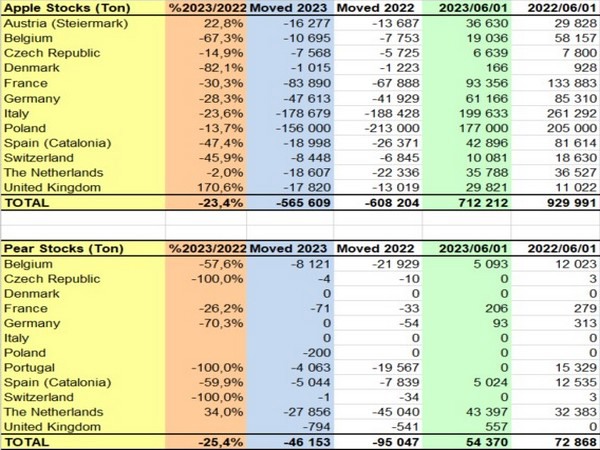 WAPA, the World Apple and Pear Association, released the apple and pear stock figures for 1 June 2023. The figures show that in Europe apple stocks decreased by 23.4% compared to 2022 to reach 712,212 T, while pear stocks decreased by 25.4% to reach 54,370 T. In the USA, apple stocks as of 1 June 2023 stood at 559,245 T (8.6% lower compared to 2022), with pear stocks also down to 17,541 T (5.9% less than 2022).