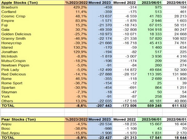 In the USA, apple stocks as of 1 June 2023 stood at 559,245 T (8.6% lower compared to 2022), while pear stocks is less at 17,541 T (5.9% less than 2022). The apples stocks of Fuji was up by 15.2%, Gala is 30.7% higher. Golden Delicious is lower by 25.7%, Granny Smith is down by 46.9% and Honeycrisp is 39.3% lower.